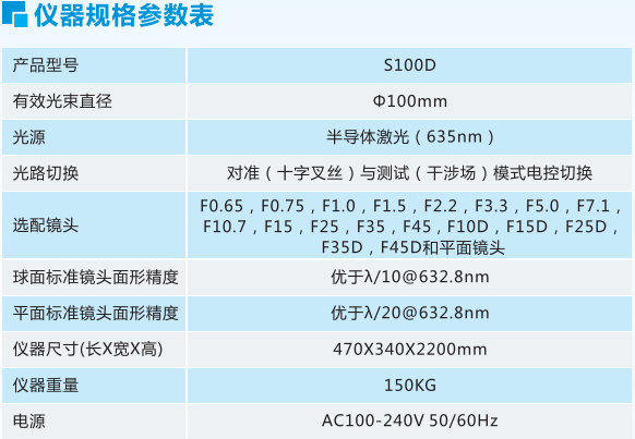 S100D倒置式激光干涉仪通光口径为Φ100mm ,镜头下置,仪器具备良好的隔振性能,适合车间大尺寸球面透镜和平面镜的大批量快速检验。标准镜头有F0.65 , F0.75 , F1.0 , F1.5 , F2.2 , F3.3 , F5.0 , F7.1, F10.7 , F15 , F25 , F35, F45和适合测量大曲率凹面镜片的发散镜头F10D , F15D , F25D , F35D , F45D ,可定制其他F数的镜头;也可选配平面标准镜及相关治具测量平面镜。