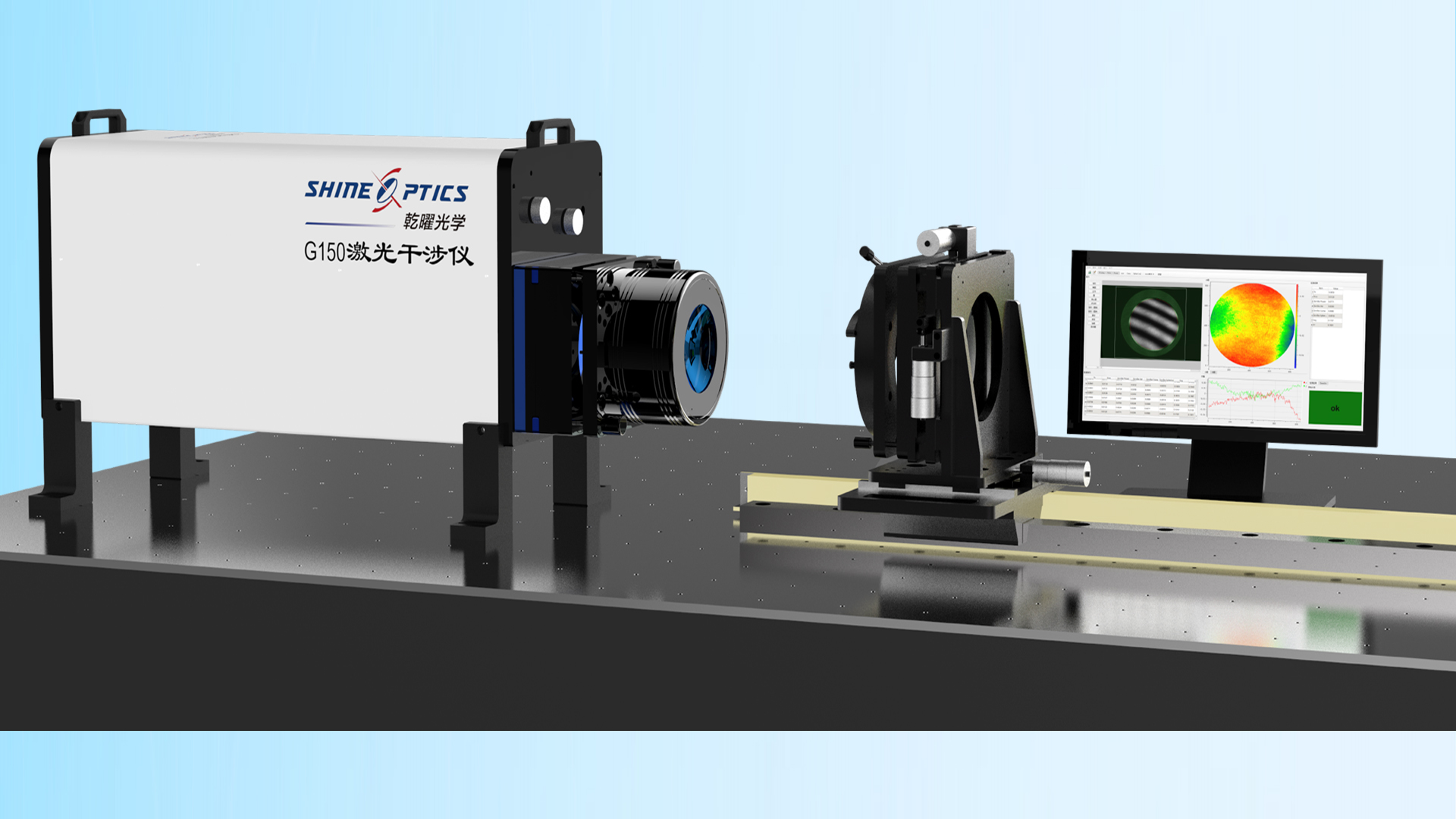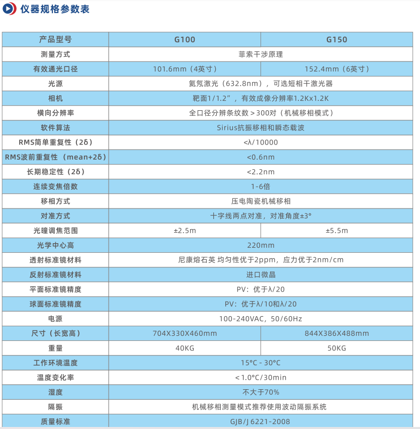 G100、G150和G200激光干涉仪的有效口径分别为101.6mm(4英寸)、152.4mm(6英寸)和200mm。菲索型的共光路设计结合Sirius抗振移相干涉条纹分析软件实现高精度的面形和波前测量。可扩展成立式平面和倒立式球面等多种结构形式的干涉仪。