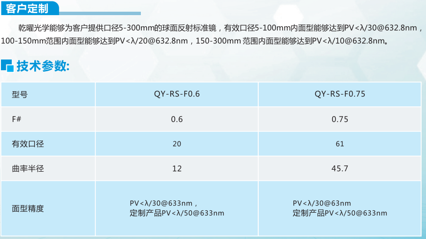 超精密球面反射标准镜的表面面形经过精密测量,可以认为是绝对球面,凹凸面均可选择。 球面反射标准镜的数据文件储存为Zygo干涉仪的标准数据格式,在Zygo干涉仪的数据中能够移 除标准球面的误差,这样测试精度能够达到PV<λ/30@632.8nm,定制产品可达到PV<λ/50@ 632.8nm.