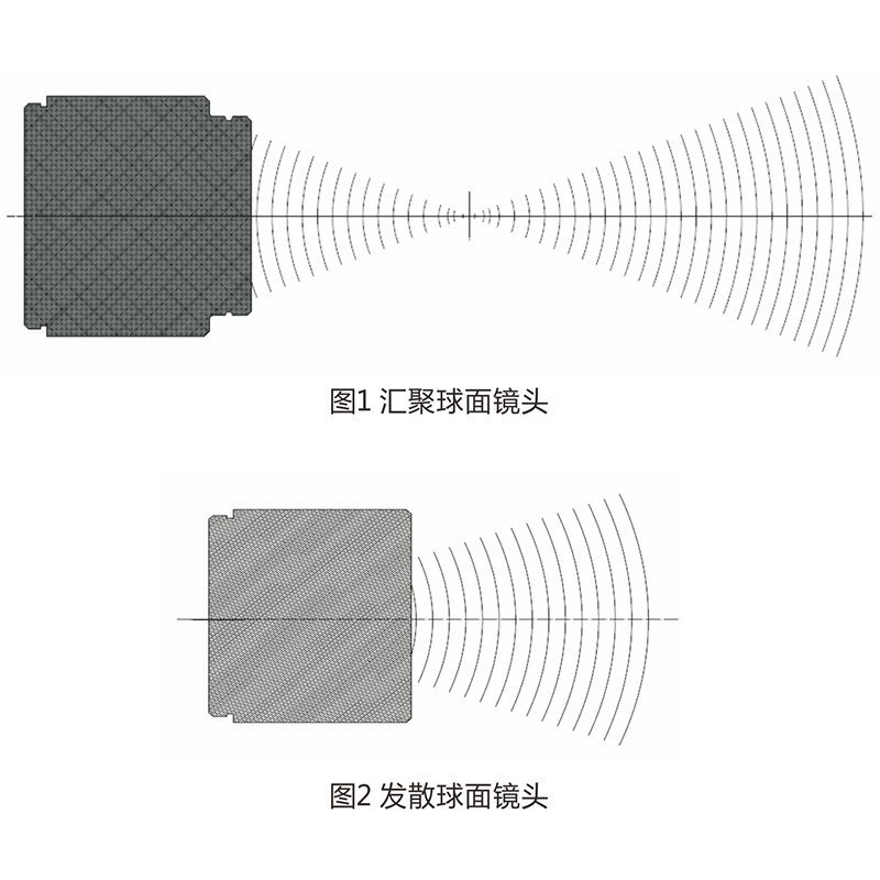 球面标准镜分为汇聚型和发散型。从汇聚球面镜头出射的光束为汇聚光束,经过镜头 焦点后变为发散光束,可以用来测量常规的凸面或者凹面光学元件,如图1;从发散镜头出 射的光束为发散光束,适合测量大曲率半径的凹面光学元件,不能测量凸面,如图2。