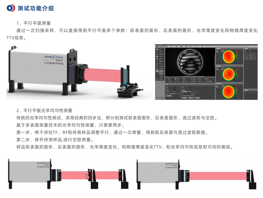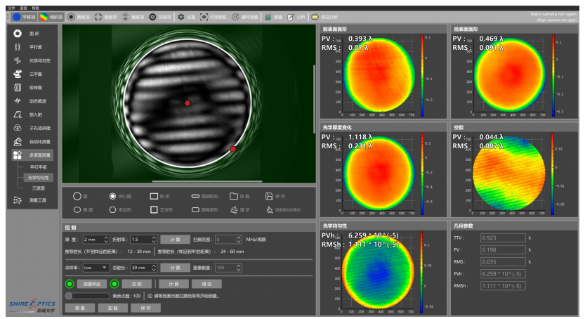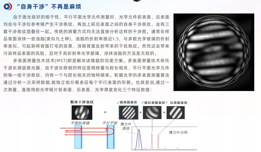 多表面测量技术技术(MST)即是解决该难题的完美方案。多表面测量技术依托于波长调谐激光器,由于波长移相的特征是相移量与腔长相关,平行平面光学元件的每一组干涉条纹,均有一个与腔长相关的独特频率。乾曜光学的多表面测量算法通过分析一次采样数据,能独立地分离表征每个平行表面的形貌。也就是说,通过一次测量,直接得到光学镜片前表面、后表面、光学厚度变化三个特征数值。