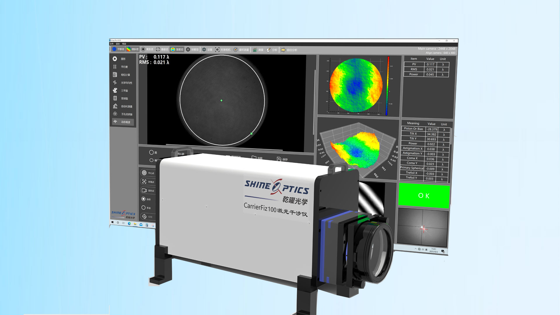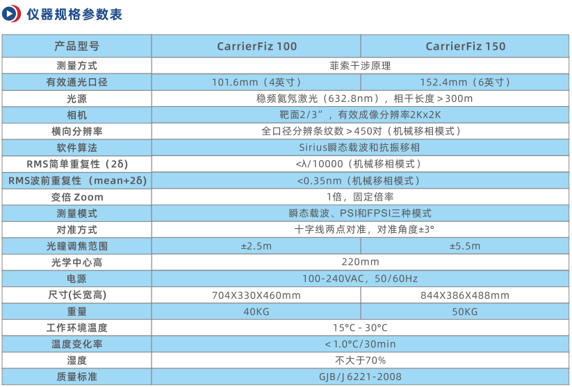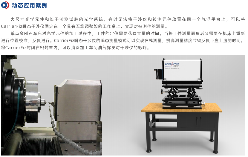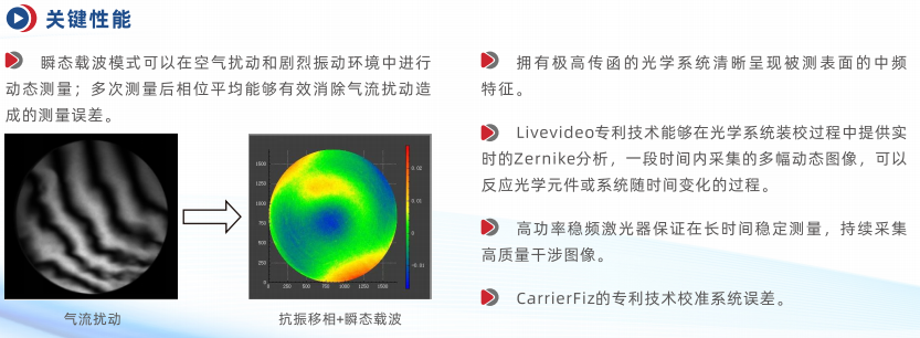 在传统机械移相模式无法测量的剧烈振动和气流扰动环境下,CarrierFiz瞬态测量技术能够提供准确可靠的光学测量。统具有极高的光学传函,高功率稳频激光器支持高速相机在瞬间采集一幅干涉条纹,Sirius干涉条纹分析软件使用载波条纹法进行解析。